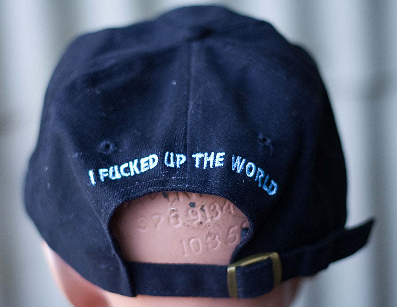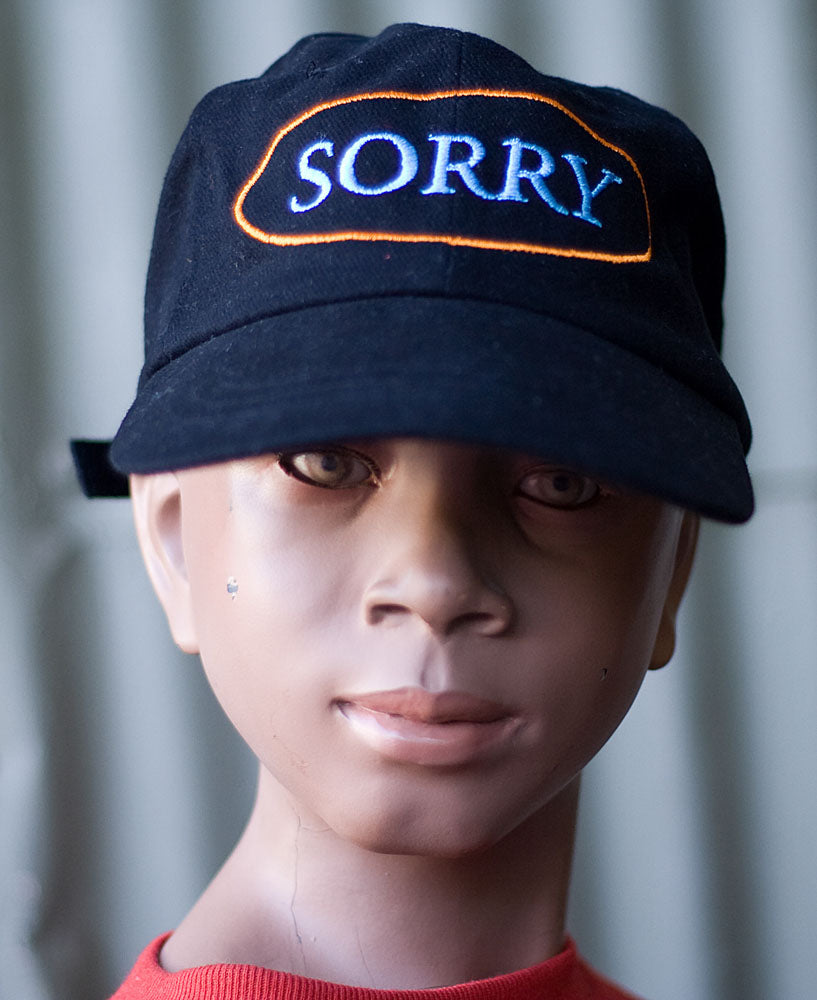 Burt Payne classic “Sorry I Fucked Up the World” hat, a limited edition based on the work Payne created for Donald Ross CalArts application. Donald Ross was one of Payne’s fictitional artists who was accepted to study at CalArts. The hat is a more general statement than Ross’ original t-shirt which read, “This White Male Hetero says ‘Sorry I fucked up the world.’”