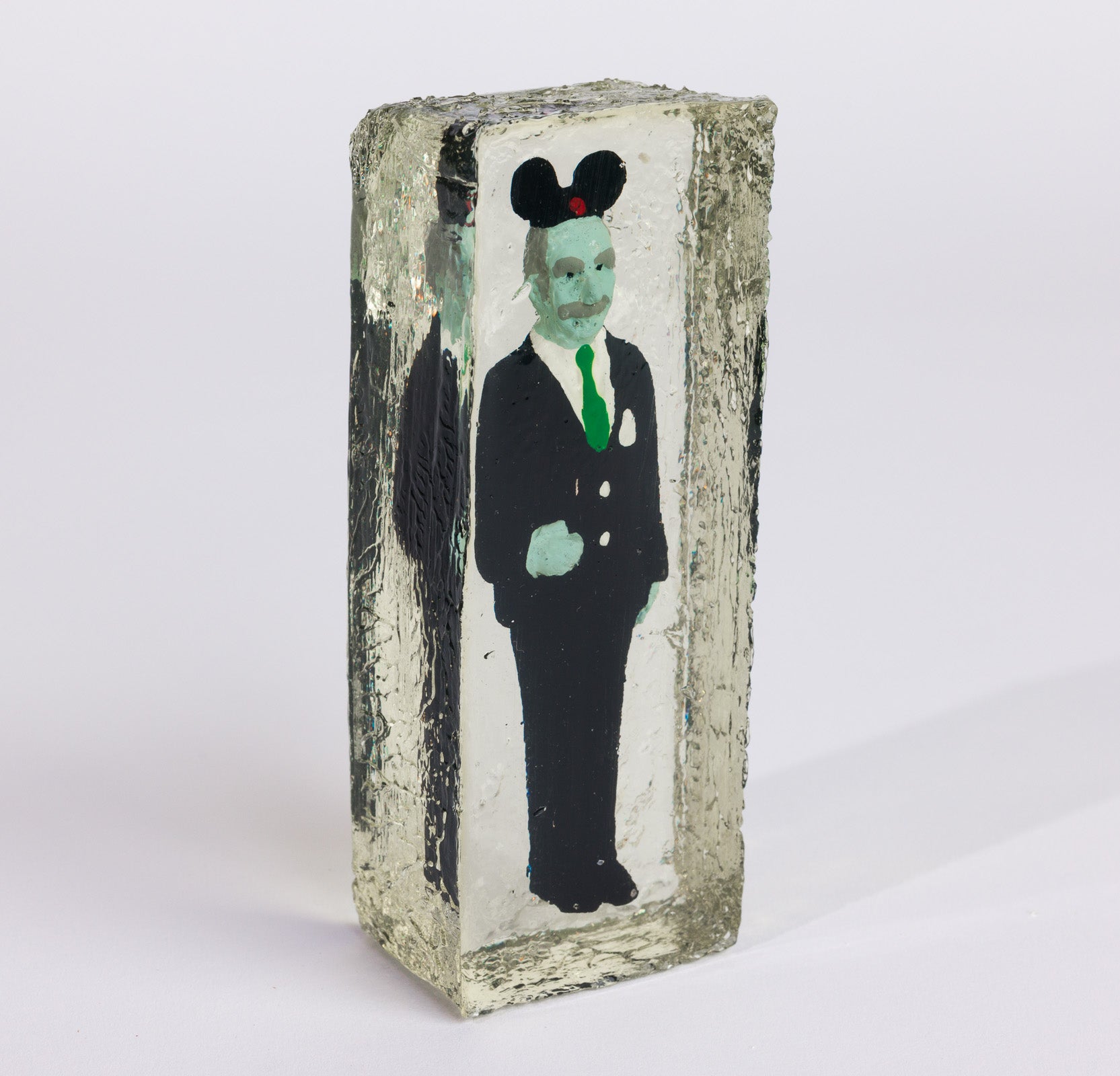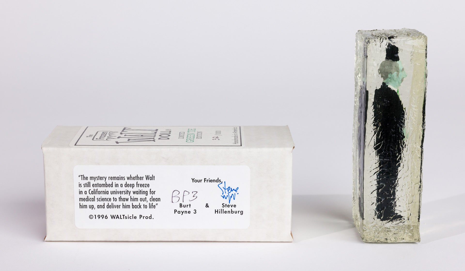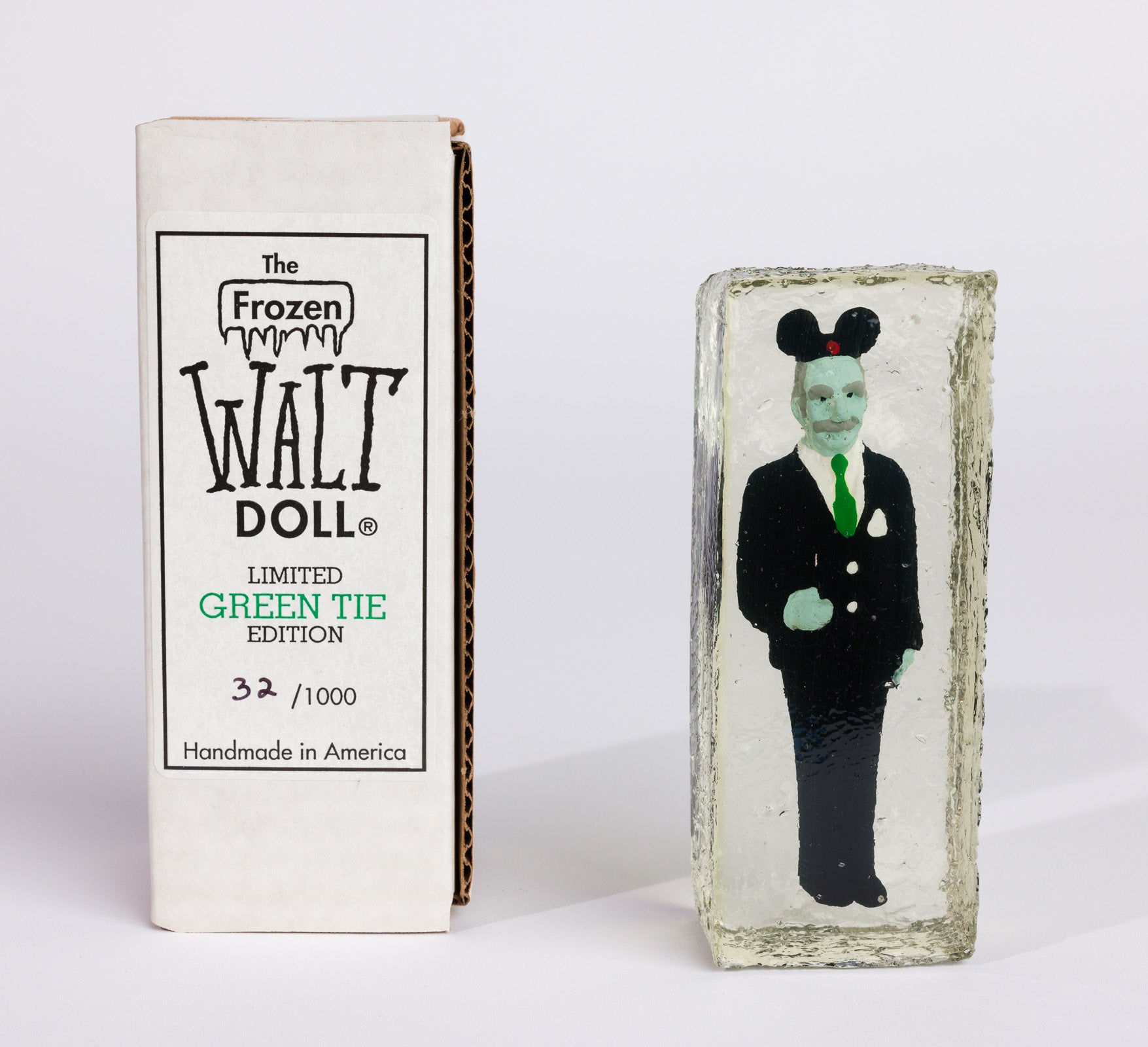 There is a persistent rumor that Walt Disney was cyrogenically preserved in the basement of a building on the idyllic Cal Arts campus. The mystery surrounding his death coupled with the fact that it was rumored he spent thousands of dollars on cyrogenic research was the inspiration for the creation of the Frozen Walt Doll, a collaborative work of art by conceptual artist Burt Payne 3 and SpongeBob Squarepants creator Stephen Hillenburg. The first two iterations, the original (Black Tie) in 1989 and the Red Tie in 1991 of which 100 of each were made, helped finance their education at CalArts, the prestigious art school founded by Walt Disney. The Frozen Walt Doll epitomizes their caustic humor and provides a wry commentary on the myths and magic of the Hollywood empire builder.