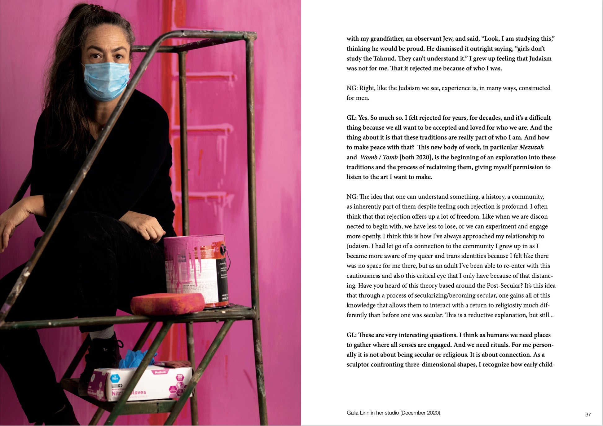 Galia Linn’s new body of work intimately addresses how tradition and spirituality are imbued in ritual objects, intermingling the notions of both women’s empowerment and human mortality. For decades, Linn has drawn inspiration from neolithic proto cities located in modern-day Southern Turkey, a society whose burial practices involved entombing the bones of deceased community members below the beds of the living, which suggests that there was no separation between life and death. In addition, evidence shows that men and women were equally treated. This exhibition builds on these ideas yet goes in a more personal direction. Because of the enforced isolation of the past year, instead of reaching outward to use distant societies as inspiration for her work, Linn turned inward, thinking about the relationship between life and death within her own cultural upbringing. The work follows Linn’s larger life-long mission of intermingling art and life and creating a seamless combination of the two.