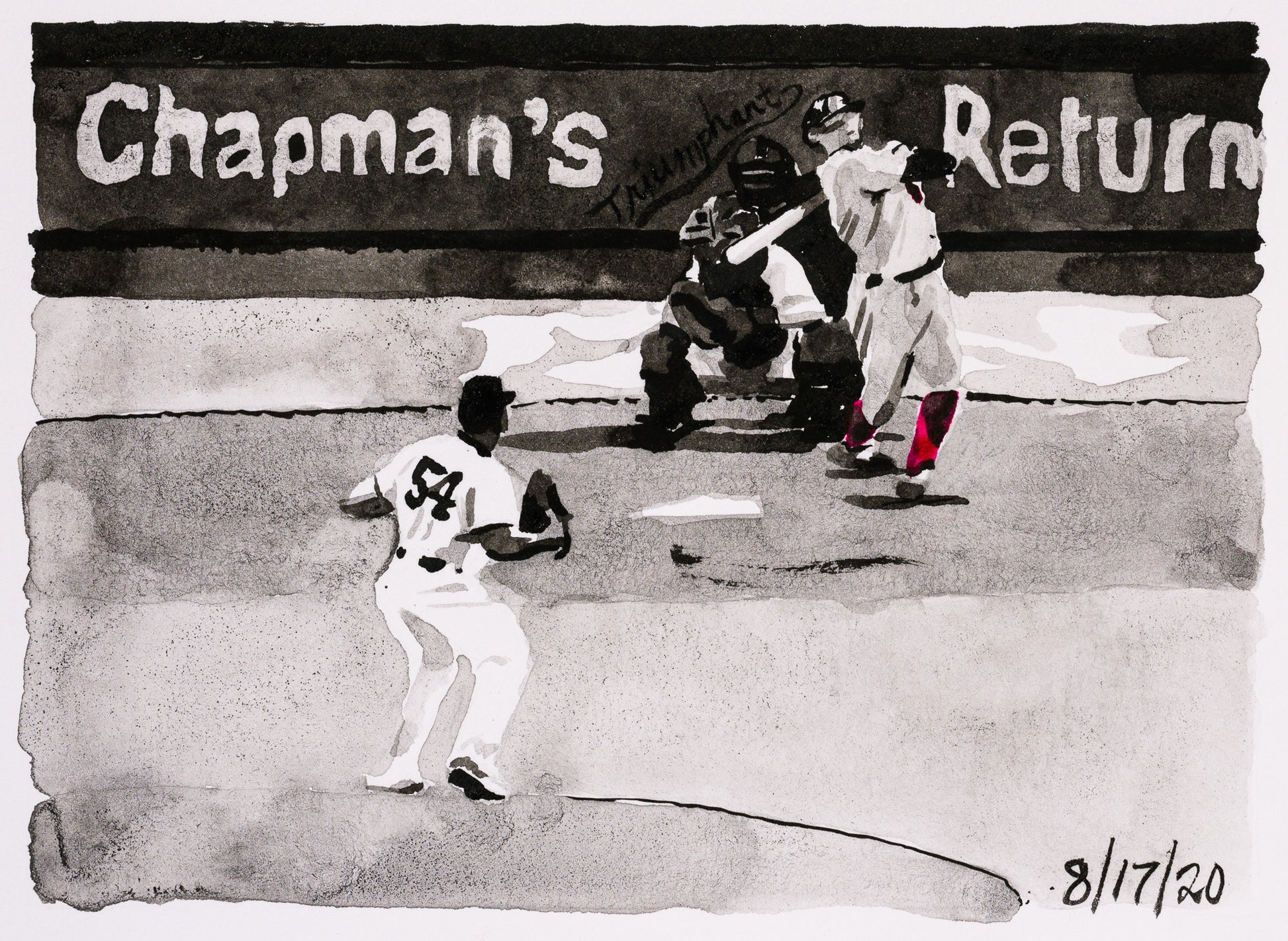 Collins’s Moonlight Graham series are devotionals to baseball. Imagining his identity as 'Moonlight Graham,' a newspaper comic illustrator, Collins highlights a play or story of interest every day from within the baseball world. He creates these works on a fictional deadline because within this fantasy, his drawing would appear in the next morning’s sports section next to the baseball scores and standings. The name Moonlight Graham reverberates with multiple meanings. It was descriptive of his own creative act of moonlighting--these were created at night after working on his studio paintings or handyman jobs. It is also a pun on social media: Moonlight (nightly) and Graham (Instagram). Lastly, as a nod to baseball fans, the name is recognizable as the name of a baseball player in the early 20th century who became a household name thanks to W. P. Kinsella’s novel, Shoeless Joe. The baseball player received his nickname because he moonlit as a doctor during his playing days, which Collins found a nice parallel to his own project.