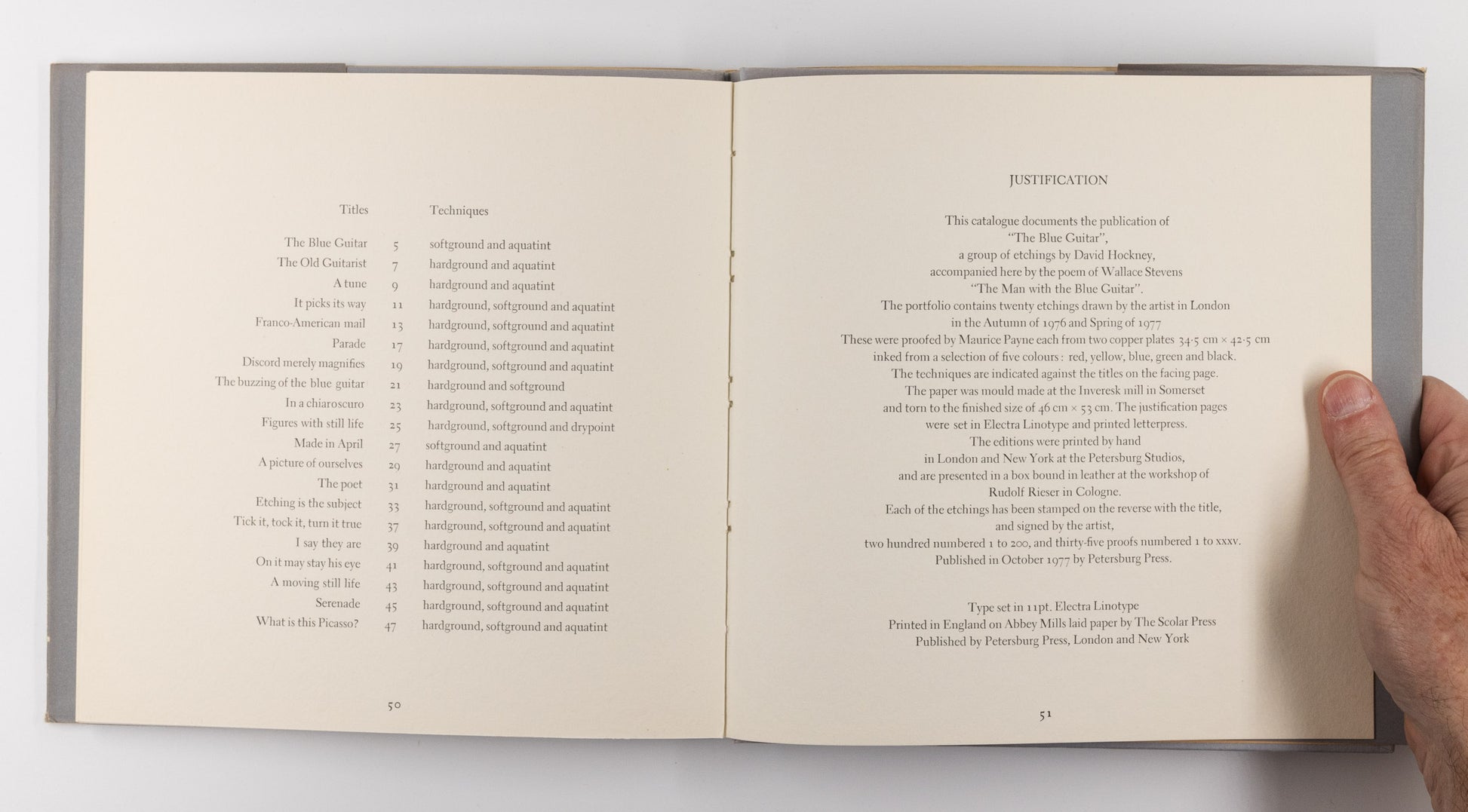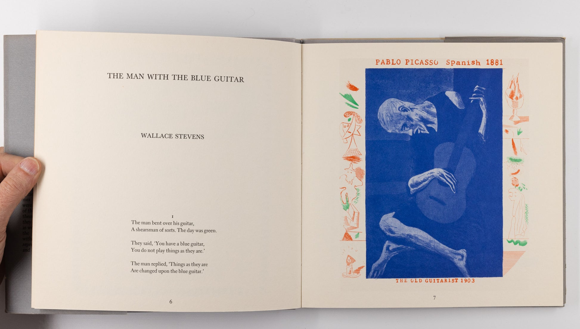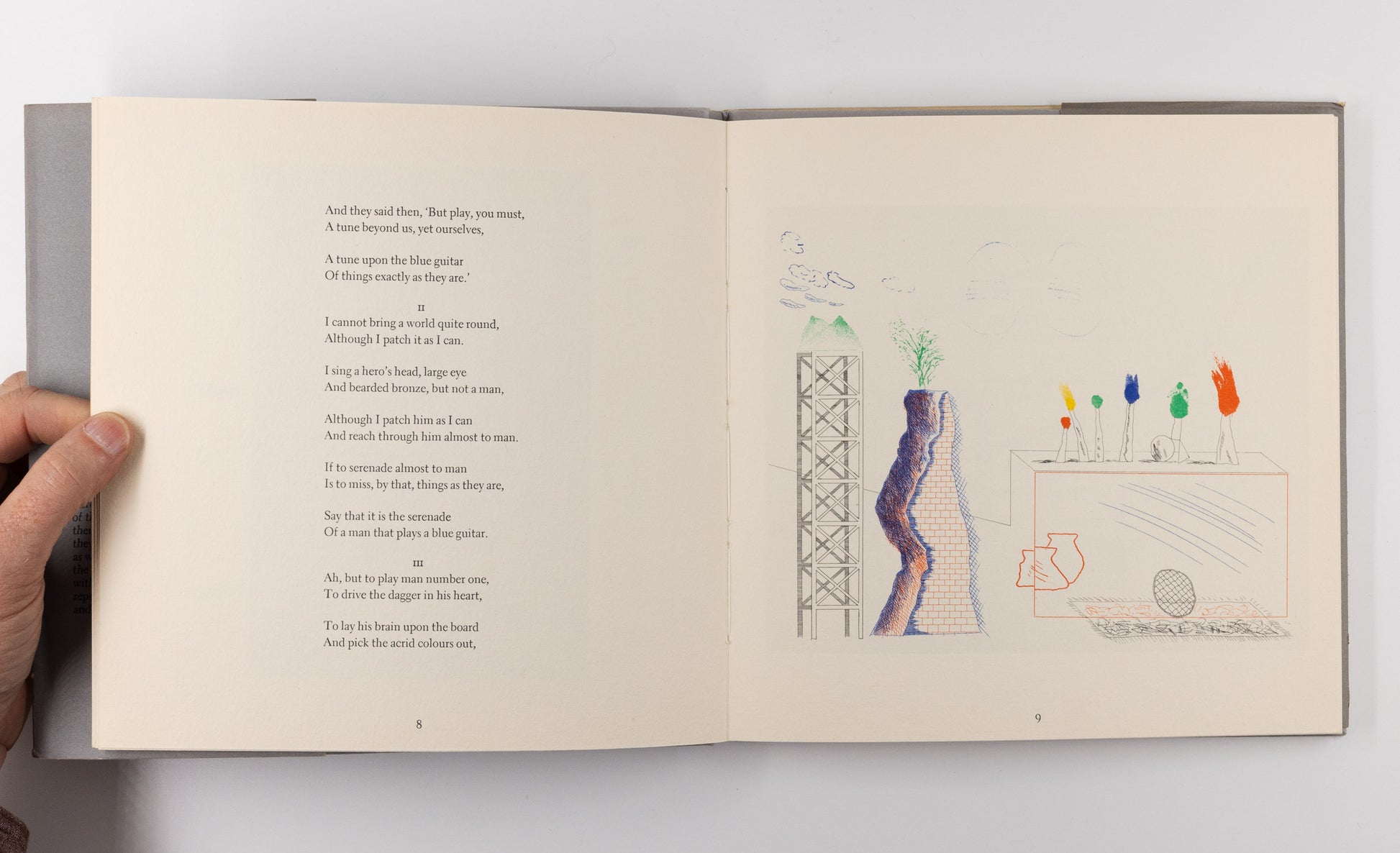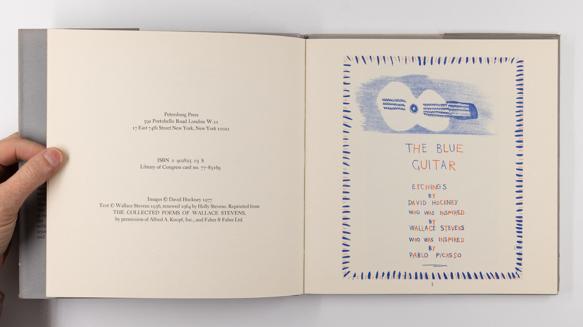 David Hockney. 'The Blue Guitar.' Hardcover. 1977. Fine. Dust Jacket. 51pp. ISBN: 0 902825 03 8. Petersburg Press. London and New York. Jacket condition: In good condition with some shelf wear.. Language: English. Each plate is accompanied by excerpts from Wallace's poem; printed on a heavy, woven stock, fine copy. 8.5 x 8.5 in.. Inventory #14709.